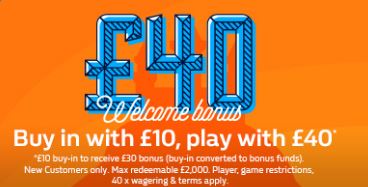 KQC: Opt-in required. New customers to Casino page only. 1x per customer. Min. Buy in £10. Bonus value 100% of Buy in. Max. Bonus £300. 40x Wagering, Max Redeemable £4,000. 50 Free Spins with x35 wagering will be awarded after the Buy in Bonus is completed, Max Redeemable £1000. Bonus expires after 7 days. Stake contributions, player, country, currency, game restrictions, and terms apply.